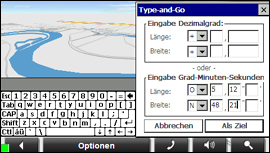 Type-And-Go wird über das POI-Warner Menü aufgerufen, in ein kleines Popup Fenster können dann die Koordinaten wahlweise in Dezimalgrad oder in Grad-Minuten-Sekunden eingegeben werden. Die neue Funktion wird z.B. Fahrern von Wohnmobilen, die Campingplätze abseits der Straße suchen, sehr gelegen kommen. Auch Geocacher können ihren PNA oder PDA mit POI-Warner nun dank Type-And-Go für ihr Hobby nutzen.