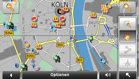 Verschweigen sollte man indes nicht, dass die angenehmen, gedeckteren Farbtöne von MN|7 schwächere Kontraste offerieren, als die z.T. grellbunten Darstellungen im Comic Stil so mancher Mitbewerber. Das macht sich naturgemäß im Freien und bei Sonnenschein auch in ungünstigen Einbaulagen innerhalb des KFZ bemerkbar. Da Navigon bisher noch keine unterschiedlichen Kartenstyles anbietet, existiert auch noch keine Alternative, bedauerlich.