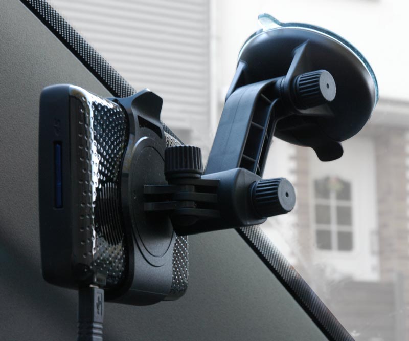 Navigon hat das 2110 max mit einem unspektakulär wirkenden Halter für die Windschutz- scheibe ausgestattet. Dieser ist kurz gehalten und auch im Vergleich zu Wettbewerbs- produkten sehr kräftig ausgelegt. Querverstrebung im Arm und universelle Justage mittels dreier Rändelschrauben runden das positive Bild ab. Glücklicherweise hat man nicht auf den Druckhebel für das Sauggummi verzichtet. Das 2110 max wird von einer Halteklammer, welche schnelle Entnahme ermöglicht, etwas zu steif, aber sicher eingefasst. Eine (etwas aufwändigere) Alternative wäre der Brodit KFZ Halter mitKugelgelenk für 2100 MAX / 2110 MAX, welchen man auf eine RichterAdapterplatte schrauben könnte.