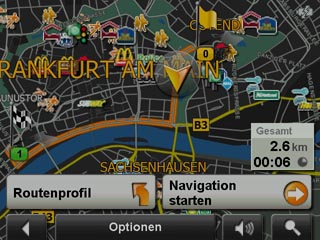 Vielen Besitzern von PDA mit VGA Screen war die POI Darstellung, wie auf den in diesem Test abgebildeten Screenshots, etwas zu klein. Insbesondere auf 2,8“ Displays waren diese mitunter schwer zu erkennen. In der neuen Try and Buy Version werden diese vergrößert, wie auf den Frankfurter Screenshots in Tag und Nachtansicht zu erkennen ist. Ob dies in POI-starken Gegenden tatsächlich die Übersicht verbessert, ist sicher Geschmackssache. Jedenfalls kann man jetzt die liebevolle Gestaltung von Start und Zielflagge mit Schattenwurf gut erkennen.