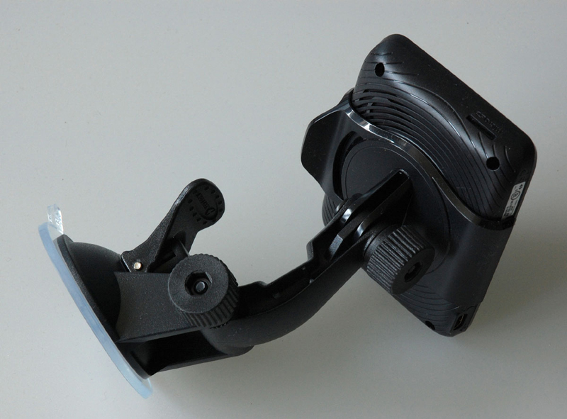 NAVIGON hat das 1210 mit einem unspektakulär wirkenden Halter für die Windschutzscheibe ausgestattet. Dieser ist kurz gehalten und verwindungsarm ausgelegt. Die Justage erfolgt mittels zweier Rändelschrauben. Glücklicherweise hat man nicht auf den Druckhebel für das Sauggummi verzichtet. Das 1210 wird von einer Halteklammer, welche schnelle Entnahme ermöglicht, sehr steif, aber sicher eingefasst.