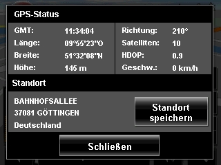 So konnte das 1210 im Praxistest tatsächlich mit kurzen TTFF Zeiten sowie mit kurzen Refix Zeiten überzeugen. Leider ist es nicht möglich, wie bei einem PDA mit installierter LOG- Software detaillierte Daten über den GPS-Empfang zu ermitteln, doch gibt es einen GPS-Status Screen, der leidlich guten Aufschluss über die jeweilige Empfangssituation gibt. Mit der Anzeige des HDOP Wertes ist eine relative Aussage über die Qualität des GPS-Signals möglich.