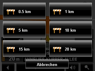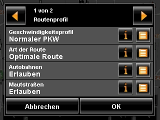 Auch das Sperren von Autobahnen, Mautstrassen und Fähren ist möglich, ebenso wie die Einstellung des Geschwindigkeitsprofils. Jeder Menüpunkt wird durch einen Klick auf das i-Symbol erläutert. Einmal unterwegs, ist es ebenfalls möglich, vorausliegende Streckenabschnitte zu sperren, z.B. weil ein Straßenabschnitt unbefahrbar ist.