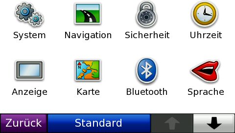 Das System mit der Möglichkeit, Routen zu simulieren (GPS aus), das Fortbewegungsmittel (Auto, Fahrrad, Fußgänger) zu bestimmen, die Einheiten (Meilen, Kilometer) festzulegen, die Tastatur umzustellen (QWERTZ, ABC) und die Fernbedienung zu (de)aktivieren. Außerdem können Systeminformationen abgerufen werden.
