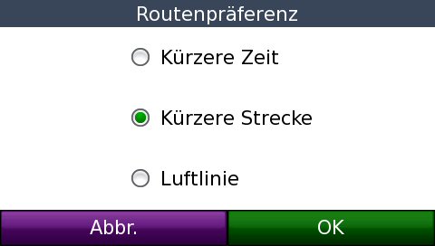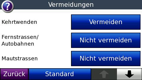 Unter Navigation stellt man die Kürzere Strecke, Kürzere Zeit oder Luftlinie ein, (de)aktiviert Vermeidungen wie Kehrtwenden, Fernstraßen/Autobahnen, Mautstraßen, Stau (dann werden selbige ohne Nachfragen umfahren), Fähren, Fahrgemeinschaftsspuren (gibt es in Deutschland nicht), Ungeteerte Straßen und Eigene Straßen- und Gebietsvermeidungen. Letzterer Punkt ist eine nähere Erklärung wert: Hier kann man mittels der Kartenansicht die Eckpunkte eines zu vermeidenden Gebietes oder einer Straße definieren. Eine schöne Innovation – mit einem Fehler: Bei Straßen kann man nur beide Richtungen zusammen sperren, wird eine Straße durch eine Baustelle zur Einbahnstraße, nutzt die Funktion leider nichts. (Zum Punkt Vermeidungen siehe auch den Zusatz im Anschluss.)
