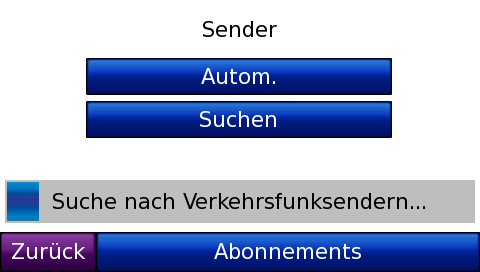 Hat man den TMC-Empfänger angeschlossen, kommt ein weiterer Button hinzu: Verkehrsfunk. Hier kann man die Sender während der Fahrt automatisch suchen lassen oder manuell einstellen. Die möglichen Sender werden angezeigt.