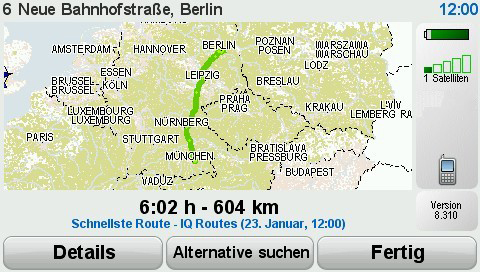 Wählt man die kürzeste Route, so wird man darauf hingewiesen, dass diese nicht immer die beste Wahl ist. Sollten sich auf der vorgeschlagenen Route unbefestigte Straßen befinden, so erscheint ein Hinweis-Screen mit der Abfrage, ob man diese Route tatsächlich nehmen will oder nicht. Auch ist bei allen Routingoptionen, außer der schnellsten Route, IQ-Routes deaktiviert.