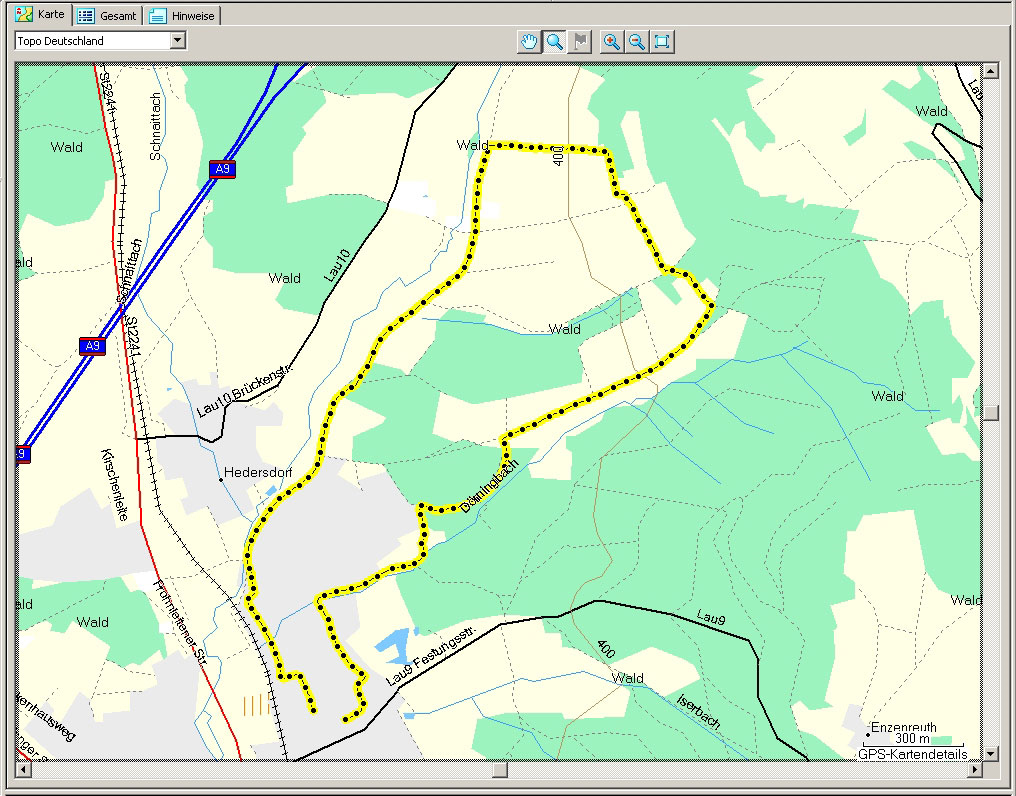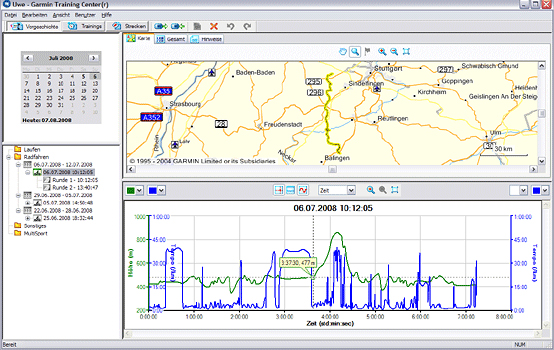 Nach dem Synchronisieren einer zuvor aufgezeichneten Fahrt per USB auf den PC, kann diese im Training Center geöffnet werden. Hierbei wird dann die Route visuell auf der Base- map des Training Centers dargestellt, welche teilweise sehr ungenau ist, da das Karten- material nur über Bundesstraßen und Autobahnen verfügt. Für mehr Details empfiehlt sich eine optionale Topo Karte, die im Handel erhältlich ist.