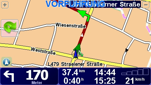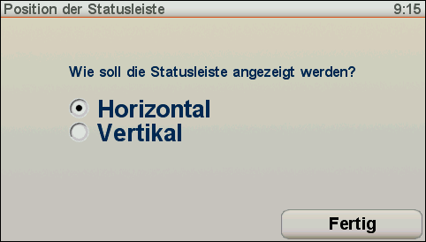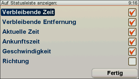 Horizontal unterhalb der Karte wird ein blauer Statusbalken mitZusatzinformationen eingeblendet. Dort werden während der Navigationpermanent Infos wie Fahrtrichtung, nächste Fahranweisung, Entfernung zum Ziel, Restzeit zum Ziel, Uhrzeit, Ankunftszeit, GPS-Empfangsstärke, aktuelle Geschwindigkeit und Geschwindigkeitsbeschränkungen auf der Strecke angezeigt. WelcheInfos dort angezeigt werden, lässt sich individuell festlegen. Außerdem lässt sich einstellen, ob die Leiste horizontal oder vertikal angezeigt werden soll.