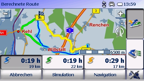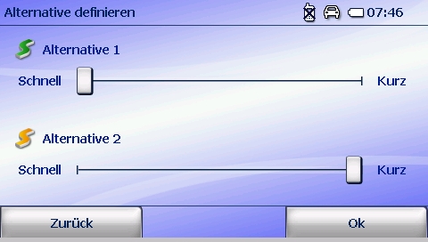 Direkt nach der Routenberechnung besteht die Möglichkeit, sich zwei Alternativrouten berechnen und anzeigen zu lassen. Die Auswahlkriterien für diese können unter dem Aspekt von schnell bzw. kurz individuell fest gelegt werden. Somit kann man z.B. eine Route unter der Option schlau errechnen lassen und diese direkt einer kurzen oder einer schnellen Route gegen- überstellen. Auswirkungen der Option schlau machen sich gemeinsam mit dem Kartenmaterial 2-2009 verstärkt bemerkbar.