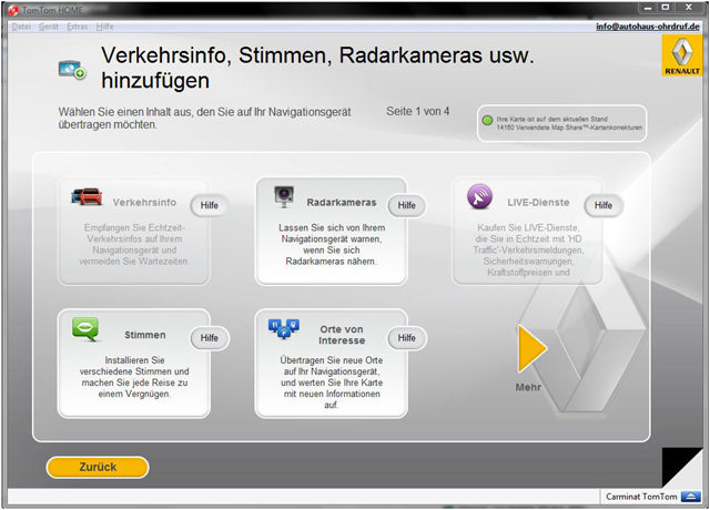 Über TomTom Home können bei Bedarf die Navigationssoftware sowie das Kartenmaterial aktualisiert werden. Wie bereits erwähnt werden auch die MapShare-Korrekturen über TomTom Home bezogen. Auch der Kauf von neuen Kartenmaterial, POI-Diensten wie die Radarkameras oder auch der Erwerb von zusätzlichenStimmen erfolgt über die Software. Genau wie die Nutzung der Garantie für die neusten Karten.
