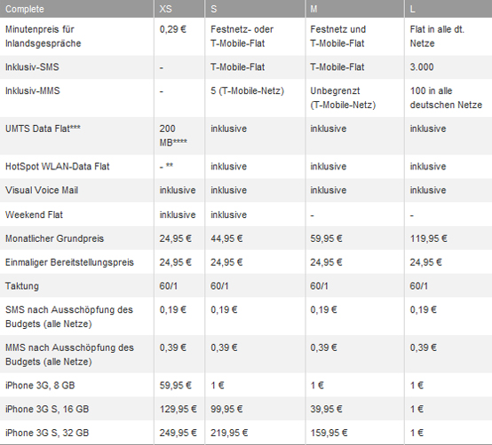 Wer den günstigsten Tarif Complete XS bucht zahlt für das iPhone 3G S monatlich 24,95 EUR und einen einmaligen Gerätepreis von 129,95 EUR (16GB) oder 249,95 EUR (32 GB). Der Tarif Complete S schlägt mit monatlichen 44,95 EUR und einem einmaligen Gerätepreis von 99,95 EUR (16 GB) bzw. 219,95 EUR (32 GB) zu Buche. Wer sich für den Complete M Tarif entscheidet, den bittet T-Mobile mit monatlich 59,95 EUR zur Kasse und verlangt einmalig 39,95 EUR (16 GB) oder 159,95 EUR (32 GB). Am günstigsten ist das iPhone 3G S im Tarif Complete L für nur 1 EUR erhältlich, allerdings muss der Kunde hier eine monatliche Grundgebühr von 119,95 EUR. Hinzu kommt jeweils der einmalige Bereitstellungspreis von 24,95 EUR.