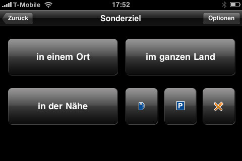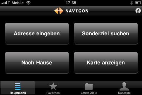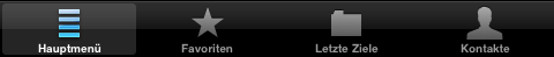 Am unteren Bildschirmrand hat NAVIGON – ebenfalls iPhone typisch – eine kleine Tab-Leiste integriert, über die man Zugriff auf die Favoriten, die letzten Ziele und Kontakte aus dem Telefonbuch des iPhones hat.