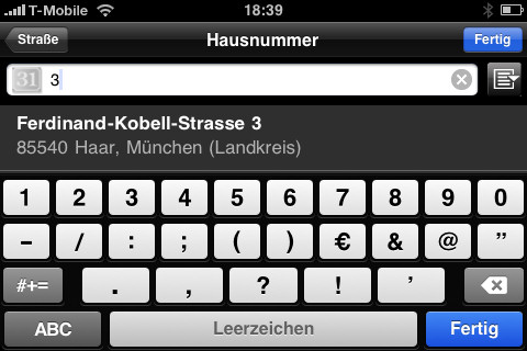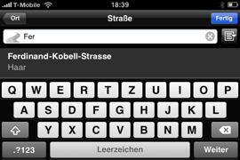 Die Eingabe einer Zieladresse über die Schaltfläche Adresse eingeben erfolgt nach dem gewohnten Schema: Ort, Straße, Hausnummer. Dabei bedarf es häufig nur der Eingabe der ersten Buchstaben, um einen korrekten Treffer zu erzielen.