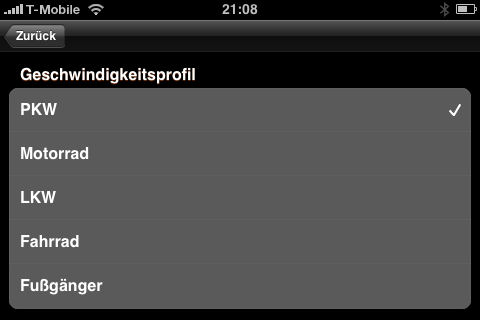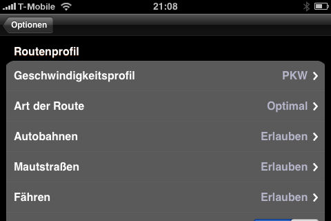 Im MobileNavigator fürs iPhone kann das Routenprofil, in dem festgehalten wird, ob die Nutzung von Autobahnen, Mautstaßen und Fähren erlaubt, vermieden oder verboten werden soll, modifiziert werden. Die Auswahl eines Geschwindigkeitsprofils beeinflusst die Auswahl der passenden Route.