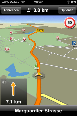 Schade ist, dass der MobileNavigator fürs iPhone kein Zugriff auf aktuelle Verkehrsmeldungen bietet. Gerade da das iPhone jederzeit auf Inhalte im Internet zugreifen kann, wäre es schön gewesen, wenn über diese Funktion Staumeldungen und Verkehrsbehinderungen hätten übertragen werden können. Vielleicht kommt diese Funktion in einem der nächsten Updates oder als kostenpflichtige Zusatzfunktion.