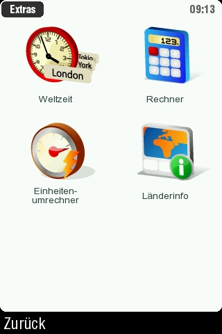 Zu erwähnen sind auch die gebotenen Extras. Neben einer Weltzeituhr, einem Taschen- rechner, so wie einem Einheitenumrechner sind auch Informationen zu den verschiedenen Ländern wählbar. Hier kann man sich über erlaubte Höchstgeschwindigkeiten oder auch über Promillegrenzen informieren. Im Ganzen eine nützliche Zusatzfunktion. Bei Bedarf braucht man so nicht die Navigationsanwendung zu beenden um andere Apps aufzurufen.