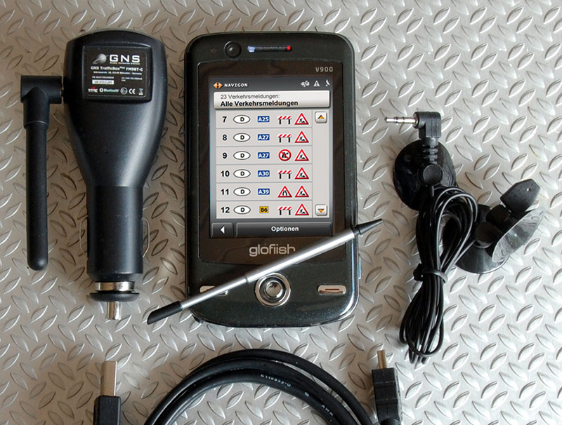 Im Test wurde die GNS TrafficBox plus FM9BT-C mit einem HTC Touch Diamond, einem E-TEN X500 sowie dem abgebildeten