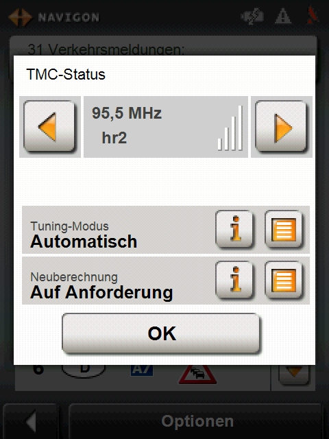 Die TMC-Funktion moderner Navigationssoftware verarbeitet TMC-Daten (Traffic-Message- Channel > Verkehrsmeldungen), die durch viele Rundfunkanstalten Europas als Teil des RDS Signals mit ausgestrahlt werden und durch interne oder externe TMC Empfänger der Navi- gationssoftware zugeführt werden.