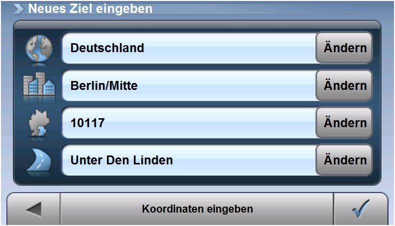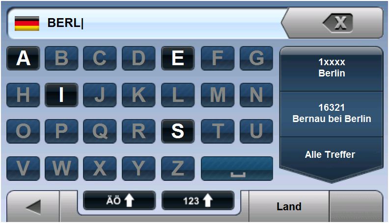 Die einfache Bedienung setzt sich auch bei der Adresseneingabe fort. Da bei der Eingabe der Zieladresse nicht zu verwendente Buchstaben ausgeblendet werden, geht auch dies leicht von der Hand. In der rechten Displayhälfte werden in Frage kommende Ziele aufgeführt, was eine komplette Namenseingabe von Orten und Straßen nicht unbedingt erfordert.