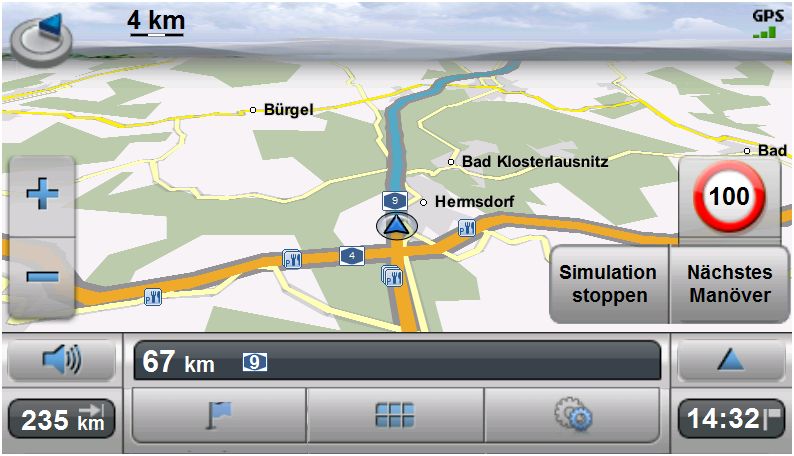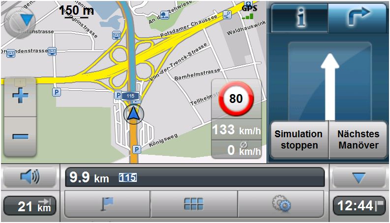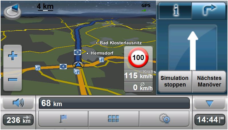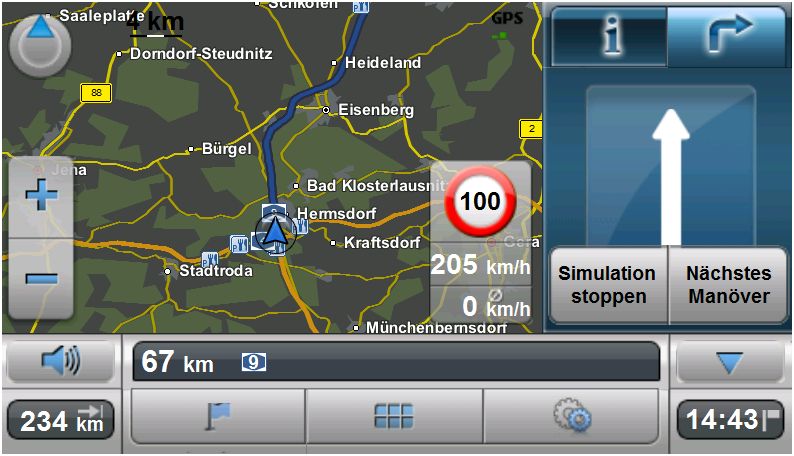 In der rechten Displayhälfte kann auf Wunsch das nächste Manöver in Form einer Pfeilansicht dargestellt werden. Wer möchte, kann auch ganz auf die Kartenansicht verzichten. Weiter wird auch die zulässige Höchstgeschwindigkeit in Form eines entsprechenden Piktogramms dargestellt. Voraussetzung hierfür ist, dass die Geschwindigkeitsdaten im Kartenmaterial enthalten sind. Dies ist nicht bei allen Straßen der Fall. Wobei BAB’s und Bundestraßen recht gut abgedeckt sind.