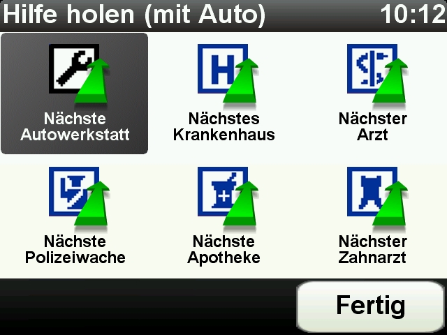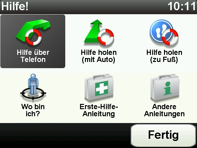 Im Menü der Navigationssoftware befindet sich der Butten Hilfe. Hier findet der User hilfreiche Informationen zu Erste-Hilfe-Maßnahmen so wie zu Länderinformationen. Weiter wird die aktuelle Position unter Benennung anliegender Straßen angegeben, um im Notfall den eigenen Standort besser beschreiben zu können. Darüber hinaus finden sich alle wichtigen POIs in unmittelbarer Nähe, die zu Fuß oder auch mit dem PKW erreicht werden können.