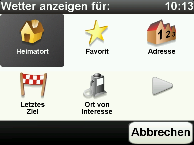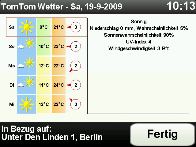Neben den Dienst TomTom Traffic bietet der TomTom NAVIGATOR 7 noch weitere kostenfreie oder auch kostenpflichtige Dienste an. Hierzu gehört die bereits angesprochene Buddy-Funktion wie auch das Empfangen von Wetterdaten. Die Wetterdaten können für jeden beliebigen Ort in einer fünf Tage Vorhersage im Display angezeigt werden. Eine interessante Funktion, gerade wenn man im Urlaub die Touren für die nächsten Tage planen möchte.
