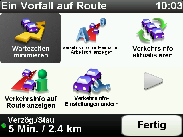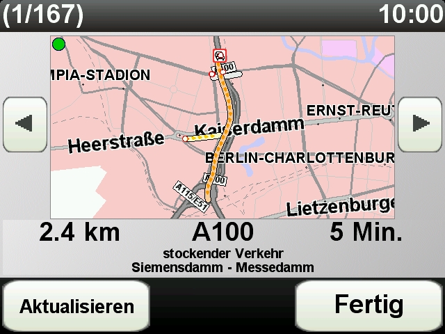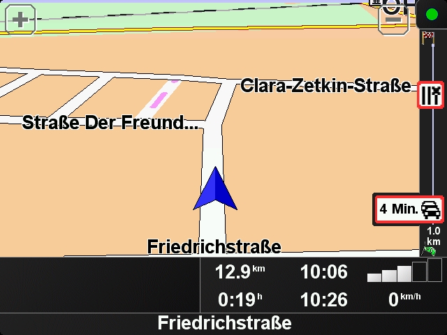 Die Verkehrsinformationen können auf Wunsch direkt in das Routing einbezogen werden. In der Navigationsansicht werden zu erwartende Events in der Verkehrsleiste auf der rechten Displayseite angezeigt. Den Aktualisierungsintervall legt der User selbst fest. Hierbei ist es notwendig, dass eine Datenverbindung zum TomTom-Server aufgebaut wird. Über diese Datenverbindung werden im eingestellten Intervall die Verkehrsinformationen empfangen.