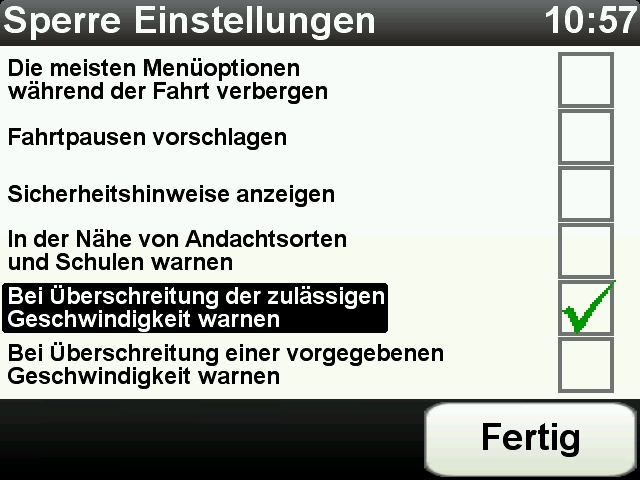 Neben der Warnung vor POIs kann auch die Warnung beim Überschreiten der zulässigen Höchstgeschwindigkeit verwendet werden. Diese Funktion ist aber davon abhängig, dass entsprechende Geschwindigkeitsprofil im Kartenmaterial hinterlegt sind. Ist dies der Fall, wird akustisch sowie optisch gewarnt, sobald die Geschwindigkeit über die vom System festgelegte Toleranz überschritten wurde. Dieser Toleranzbereich ist allerdings nicht variabel wählbar.