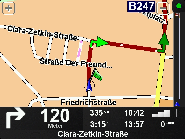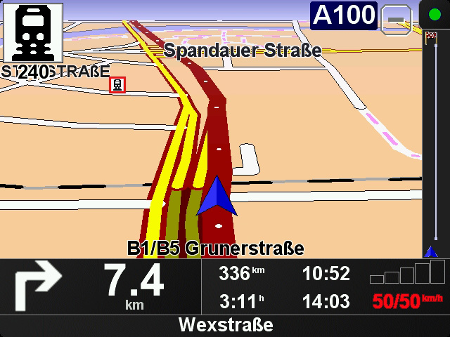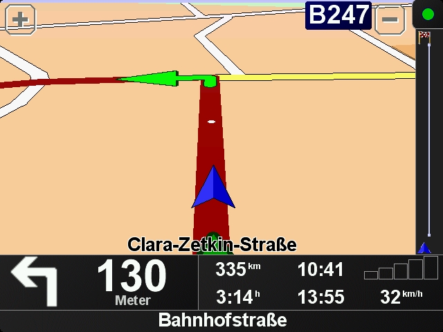 Die Navigationsansicht ist sehr gut strukturiert, alle wichtigen Events werden schnell erkannt. Die Lautsprecheransagen sind klar und deutlich. Die Ansicht der Navigation erfolgt wahlweise im 3D– oder auch 2D-Modus. Die Karte kann im 2D-Modus in Fahrtrichtung oder auch nach Norden ausgerichtet werden. Die Routenberechnungszeiten sind im Vergleich zu den aktuellen PNA-Geräten sehr schnell. Dafür muss aber auch auf IQ-Routes verzichtet werden, wodurch der zeitliche Vorsprung zu erklären ist.
