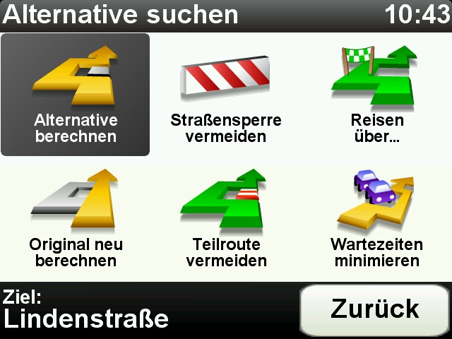 In das aktive Routing kann entsprechend den Vorgaben direkt eingegriffen werden. So kann man sich eine alternative Route vorschlagen lassen, Straßen in einem bestimmten Radius umfahren oder auch einzelne Straßen aus dem Routing ausschließen. Weiter kann auch in das aktive Routing ein Zwischenziel hinzugefügt werden.