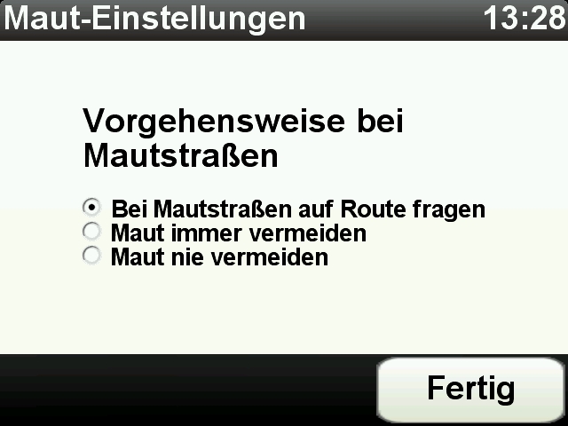 Neben den genannten Möglichkeiten kann für das PKW-Routing die Autobahn auf Dauer ausgeschlossen werden. Hilfreich ist die Option begrenzte Geschwindigkeit. Liegt die bauartbedingte Höchstgeschwindigkeit eines Fahrzeuges zum Beispiel unter 60 km/h, so werden bei der Nutzung dieser Funktion alle Straßen, die eine höhere Mindestgeschwindigkeit vorschreiben, aus dem Routing ausgeschlossen, beispielsweise Bundesautobahnen. Darüber hinaus werden die Routenzeiten entsprechend der eingegebenen Geschwindigkeitsbegrenzung berechnet.