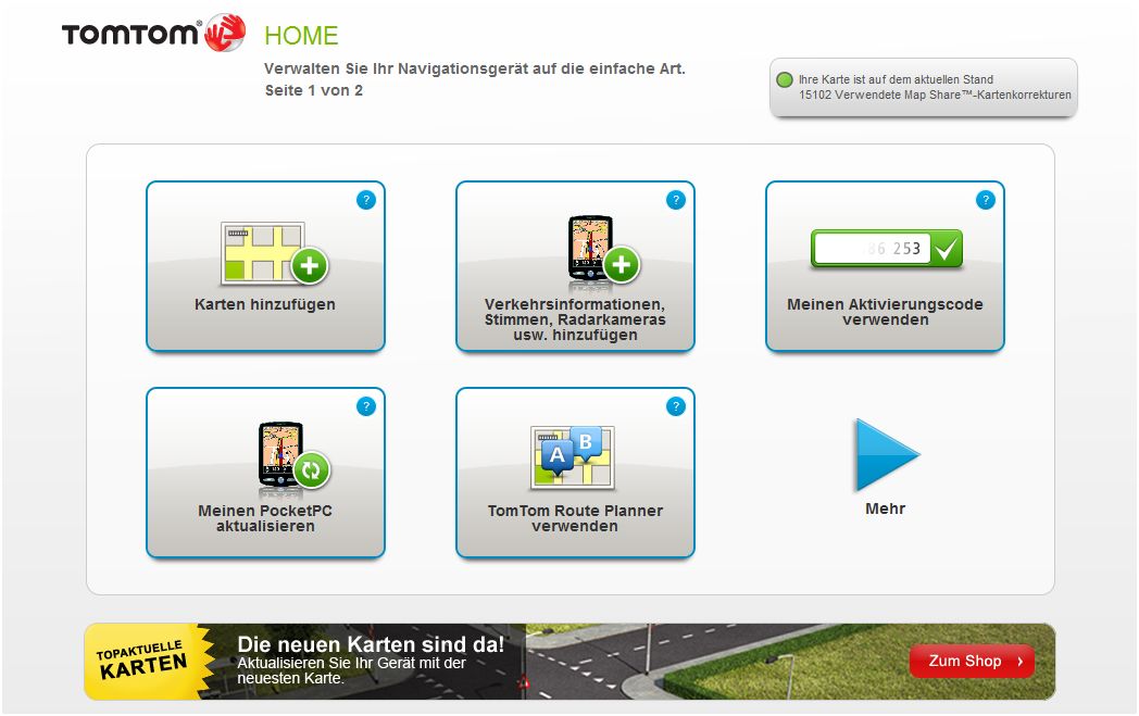 Über TomTom Home können bei Bedarf die Navigationssoftware sowie das Kartenmaterial aktualisiert werden. Wie bereits erwähnt werden auch die MapShare-Korrekturen über TomTom Home bezogen. Auch der Kauf von neuen Kartenmaterial, POI-Diensten wie die Radarkameras oder auch der Erwerb von zusätzlichen Stimmen erfolgt über die Software.