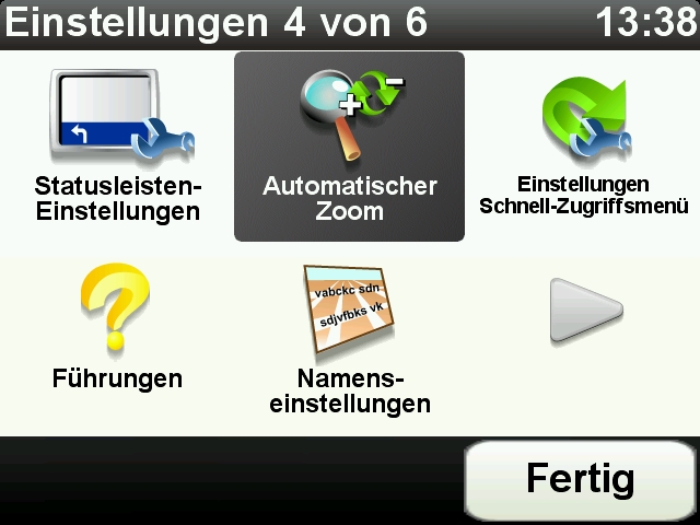 Einige Einstellungen im Menü erleichtern im täglichen Gebrauch die Bedienung des TomTom NAVIGATORS 7, so zum Beispiel die Konfiguration des Schnell-Zugriffsmenüs. Hier können bis zu sechs vorgegebene Funktionen zugewiesen werden. Über ein entsprechend leicht transparentes Symbol, auf der linken Displayseite in der Navigationsansicht, wird der Zugriff ermöglicht. Hierher können Funktionen wie das Umschalten zwischen Tag- und Nachtansicht, die Umschaltung von 3D auf 2D oder auch die Stummschaltung verknüpft werden. Weiter findet man im Einstellungsmenü auch die Aktivierung der Geschwindigkeitsanzeige in der Statusleiste sowie die horizontale oder vertikale Ausrichtung.