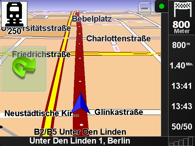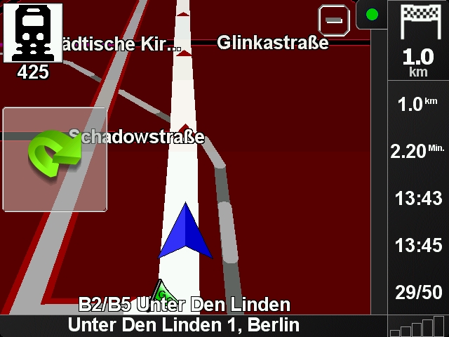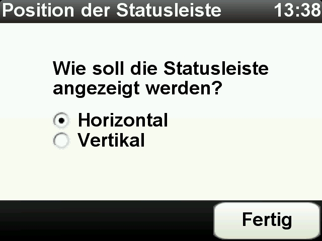 Tippt man zum Beispiel auf die linke untere Hälfte der Statusleiste, kann man direkt die Lautstärke regeln, ohne weiter ins Einstellungsmenü gehen zu müssen. Klickt man auf die rechte Displayseite in die Verkehrsbar, gelangt man direkt in das Einstellungsmenü für die Verkehrsinformationen.