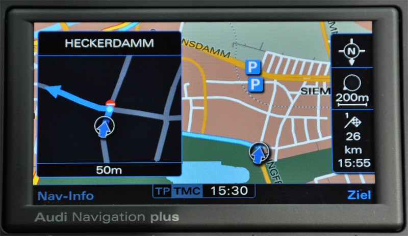 Das Audi RNS-E leitete uns auf allen unseren Teststrecken und den gut 3000 Testkilometern immer korrekt, auch das Rerouting nach Empfangsabbruch ging schnell von statten. Überhaupt kann das Audi Navi mit einem sehr schnellen GPS-Fix aufwarten, nach der Zieleingabe startet die Routenführung ohne große Pausen.