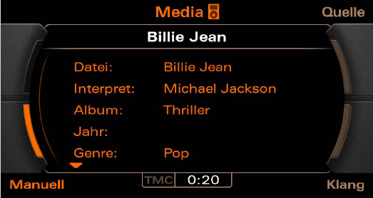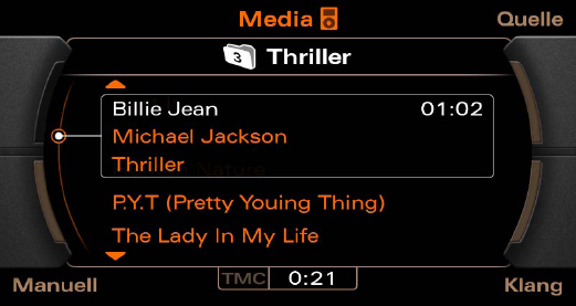 Das Audi Music Interface unterstützt die Codecs MP3, WMA und AAC. DRM-geschützte Muskdateien können nicht abgespielt werden. Playlisten erkennt das System im *.m3u, *.pls und *.b4s Format.