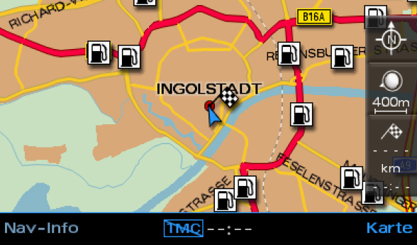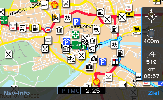 Wer mit seinem Audi eine Panne hat, findet mit einem kurzen Blick auf die Karte die nächst- gelegene Audi Fachwerkstatt. Für eine bessere Übersicht lassen sich einzelne nicht benötigte POI Kategorien über das Menü deaktivieren.