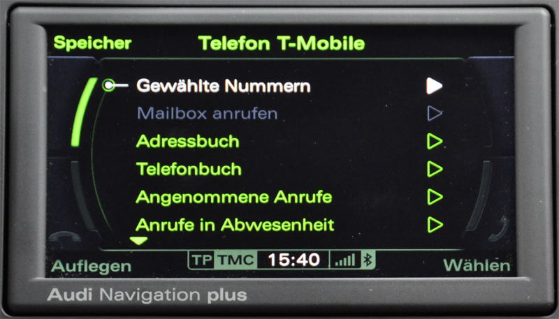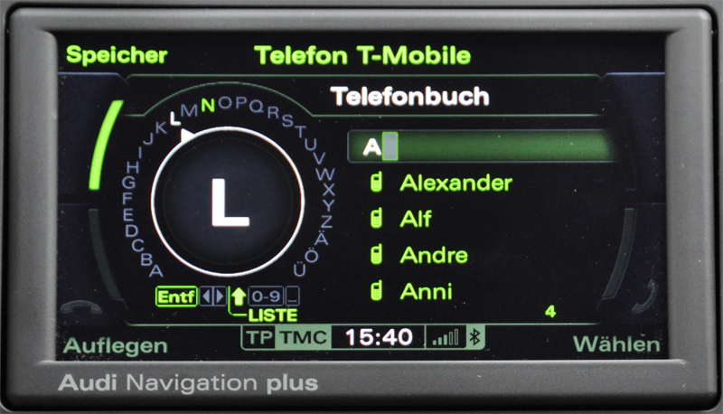 Telefone können über Bluetooth mit dem RNS-E 2009 verbunden werden (sofern zusätzlich eine Bluetooth Freisprecheinrichtung bestellt wurde). So steht eine komfortable Verwaltung der Funktionen der Freisprecheinrichtung bereit. Rufnummern können entweder aus dem Telefonbuch oder aber geordnet nach gewählten Nummern, angenommenen Anrufen oder nach „Anrufe in Abwesenheit“ ausgewählt werden.