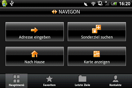 Am unteren Bildschirmrand hat NAVIGON eine kleine Tab-Leiste integriert, über die man Zugriff auf die Favoriten, die letzten Ziele und Kontakte aus dem Telefonbuch des Android-Phones hat.