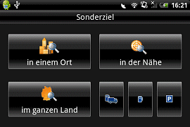 Die Menüführung des MobileNavigator kommt auf Android mit einem gleichen Aufbau wie beim iPhone daher. Im Hauptmenü kann man das Ziel über verschiedene Wege eingeben. Jeder der vier Punkte im Hauptmenü öffnet eine neue Seite von der man über die Android typische Zurück Taste wieder ins Hauptmenü gelangt.