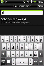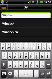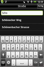 Der MobileNavigator bietet in der Hochansicht (Portrait) bereits während der Eingabe, unter dem Textfeld, mögliche Treffer an, die wenn korrekt, durch einen einfachen Klick ausgewählt werden können. In der Queransicht (Landscape) wurden auf unserem Testgerät keine möglichen Treffer angezeigt, da die virtuelle Tastatur den gesamten Bereich einnahm.