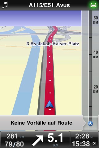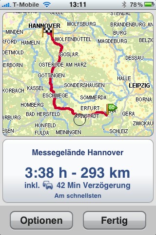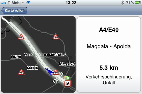 Im folgenden ein paar Bilder zur Veranschaulichung, wie die Verkehrsinformationen via HD-Traffic bei TomTom umgesetzt wurde:
