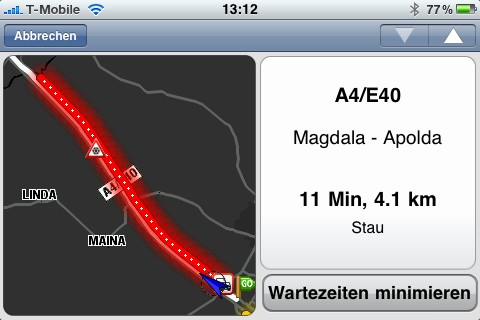 Man kann natürlich auch selbst die Wartezeit minimieren bevor die App einen darauf hinweist indem man in der Trafficleiste die Stauinfo antippt und im nächsten Fenster auf Wartezeit minimieren klickt.