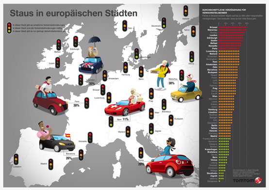 In einer umfangreichen Untersuchung hat TomTom die 59 stauanfälligsten Städte Europas ermittelt. Dabei landete Brüssel an der Spitze der Liste, knapp vor der polnischen Hauptstadt Warschau. Spanien und Nordeuropa hingegen versprechen eher entspanntest Fahren. Auch Deutschland ist mit 11 Großstädten in den TOP 50 vertreten.