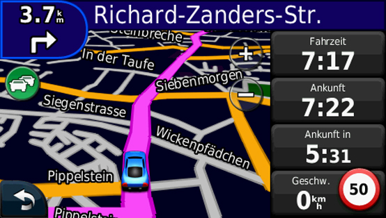 Ein Navigationsgerät steht und fällt mit der Optik des Fahrtfensters. Bei Garmin hat sich diese über die Jahre so gut wie nicht verändert: Noch immer erstrahlt das Display in schönster bonbonfarbener Knuddel-Grafik, wählbar in 2-D und 3-D. Dabei ist die Straßendarstellung schlicht und spartanisch, aber zweckmäßig gehalten und verwirrt nicht mit Details wie Gebäudeumrisse oder Points of Interest (POIs). Die isometrische 3-D-Sicht wirkt leicht verzerrt und bei weitem Zoom gekippt. Die Fahrtroute wird als violette Linie dargestellt und liegt derart breit über der befahrenen Strecke, dass Straßen links und rechts davon überdeckt werden können. Die Sicht zoomt bei Abzweigungen automatisch näher heran und entfernt sich z.B. bei Autobahnen, sodass man das noch Kilometer entfernte Ende der Route bereits früh am Zielfähnchen erkennen kann.
