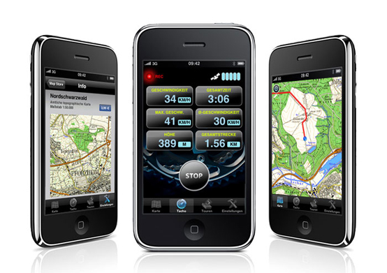 Für eine genaue Orientierung im Gelände stehen über den integrierten Map Store zusätzlich amtliche topografische Karten gegen einen geringen Aufpreis zur Verfügung. Die Karten zeigen Wald- und Wanderwege, Gewässer und die Topografie des Geländes. Die Karten werden nach dem Kauf auf dem iPhone installiert und stehen so auch ohne einen Onlinezugang unterwegs bereit.
