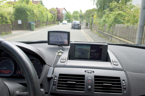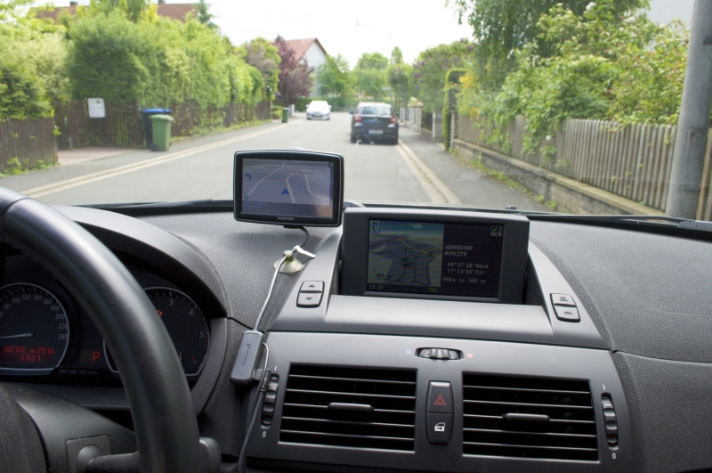 Das TomTom XXL IQ Routes besitzt ein 16:9-LCD-Display mit einer Bildschirmauflösung von 480 X 272 Pixeln. Durch die 5-Diagonale (entspricht 13 cm) wird sichergestellt, dass – egal wo oder in welcher Entfernung das Gerät an der Frontscheibe vom Fahrer entfernt angebracht wird – eine perfekte Ablesbarkeit sowohl der Routenführung als auch der Informationen über Restzeit bis zum Ziel, Ankunftszeit, Geschwindigkeit, Abbiegehinweise etc. gegeben ist. Das ist eine prima Sache und dient unseres Erachtens absolut der Verkehrssicherheit, da tatsächlich ein einziger Blick genügt, um alle Informationen zu erfassen zu können. Dies zeichnet das TomTom XXL IQ Routes im Vergleich zu PNA mit geringerer Größe wirklich deutlich aus. Das Bild zeigt die Größenverhältnisse im Vergleich zu einem Festeinbau.