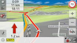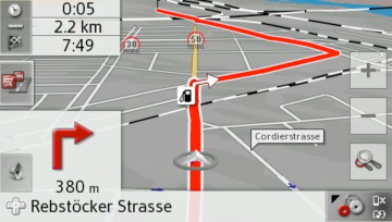 Seine wahre Stärke zeigt das Gerät aber während der Navigation, auch unter Verwendung aller grafischen Optionen (3D-Gebäude, 3D-Gelände) läuft das Gerät sehr flüssig, ein Ruckeln ist nur zu erkennen, wenn man zügig durch eine 180° Kurve fährt.