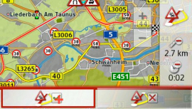 Auch bei eingehenden TMC-Verkehrmeldungen wurden die Umleitungen stehts logisch berechnet. Liegt eine Störung auf der Strecke, kann man in den Einstellungen wählen, ob man die Meldungen generell ignorieren will, manuell entscheiden möchte, ob die Störung umfahren wird oder dem Gerät die Entscheidung überlassen. Im ersten Fall wird neben der Originalstrecke die Alternative auf der Karte dargestellt und man kann eine der beiden Strecken wählen. Bei automatischer Umfahrung werden beide Alternativen ebenfalls eingeblendet und man hat die Möglichkeit, manuell eine von beiden zu wählen. Verweigert man, wie bei einer automatischen Einstellung gewünscht, die Eingabe, übernimmt das Gerät nach einer kurzen Zeitspanne die Entscheidung und wählt die dann schnellste Route unter Berücksichtigung der Verzögerung.